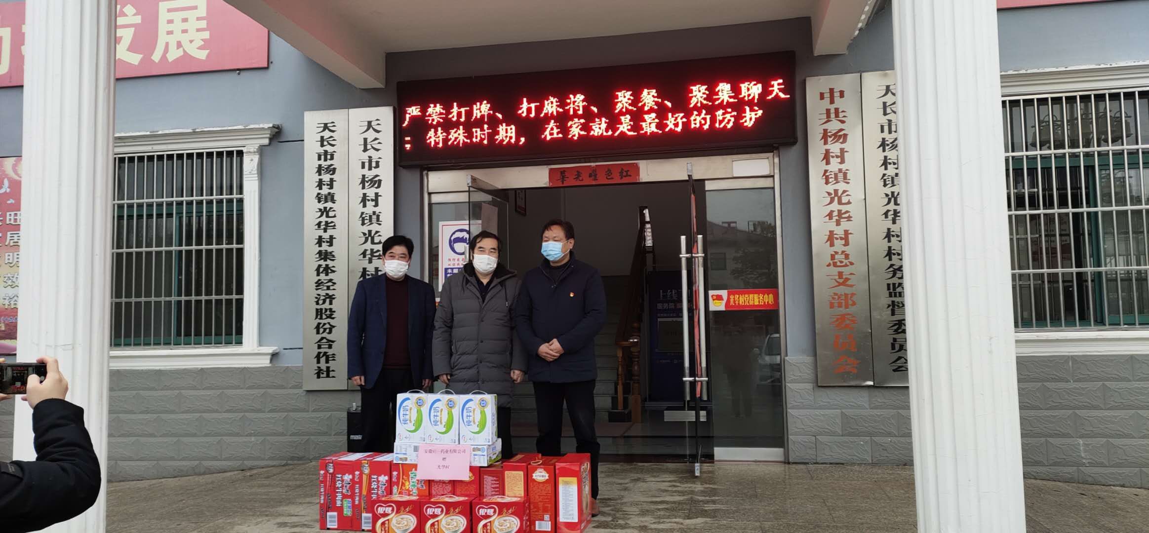 在疫情期間,安徽峆一藥業有限公司欣總看到村基層工作工作人員冒著嚴寒奮戰在疫情防控的第一線,深受感動,作為一個黨員,想要為村里做些什么,主動聯系楊村鎮:表示想為村送些營養品,希望戰斗在一線的人員在吃飯不方便的時候能夠填飽肚子。光華村黨總支書記任保貴對峆一藥業欣總表示感謝,并表示為人民服務是我們的使命,我們會繼續做好疫情防控工作,帶領群眾打贏這場戰爭。
