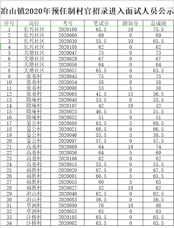 冶山鎮2020年預任制村官招錄進入面試人員公示
