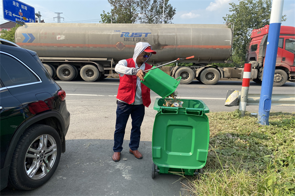 活動中,志愿者們拿著垃圾夾、鏟子等工具,到G345集鎮段(高架橋至中潤集團)清理路邊生活垃圾、綠化帶內的雜物,并對沿路商戶門前亂停電動車現象進行勸導。