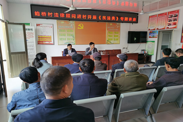 鮑橋村黨支部為提升村民法治觀念,讓村民自身權益得到合法保障,利用黨員活動日開展《民法典》法律知識專題講座。