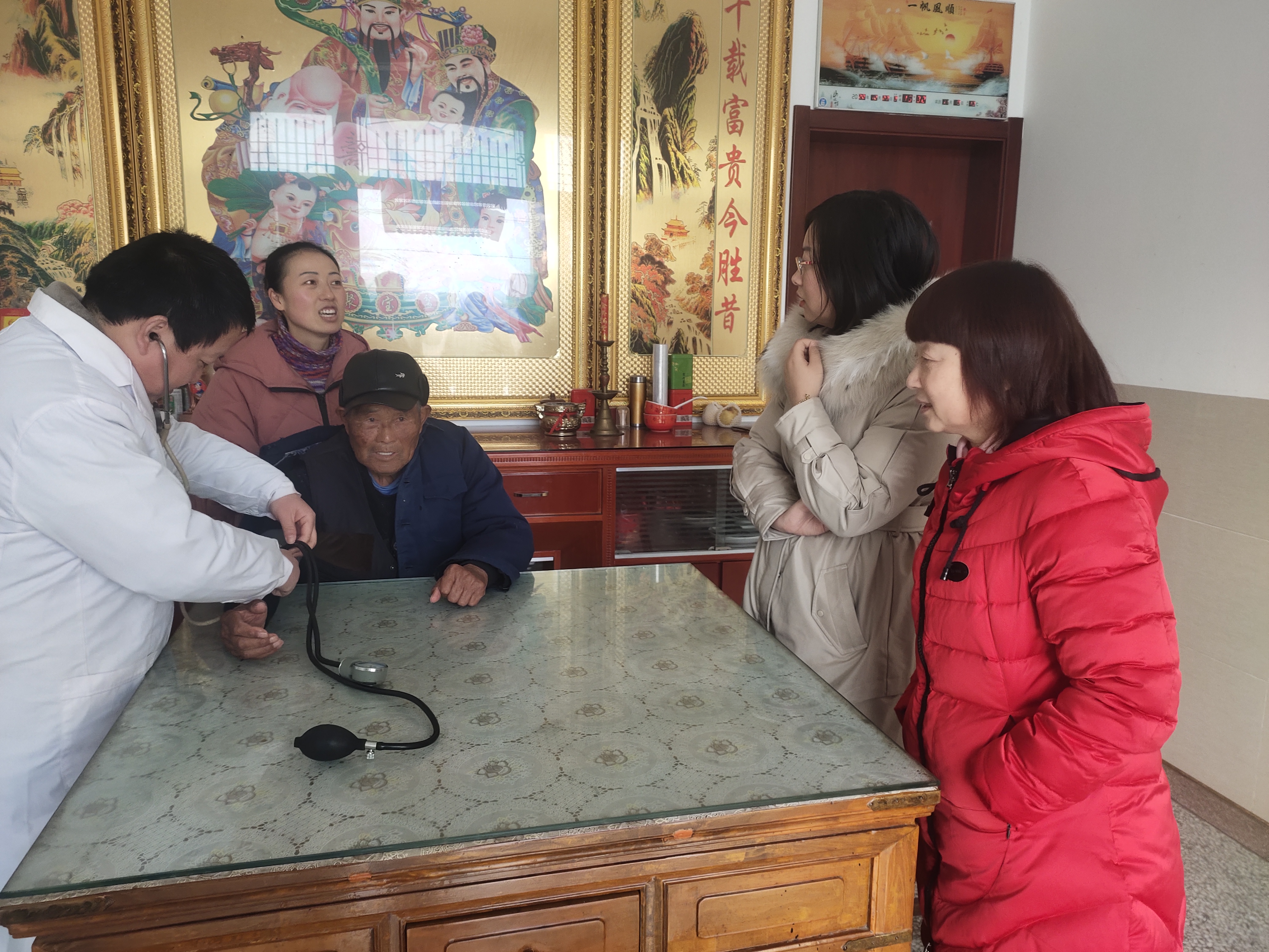 沿湖村衛(wèi)生室村醫(yī)李金良給老人進(jìn)行血壓測(cè)量,鎮(zhèn)領(lǐng)導(dǎo)詳細(xì)詢問了老人的生活、身體情況,叮囑老人按時(shí)服用血壓藥,注意保暖,同時(shí)也給老人拜個(gè)早年。