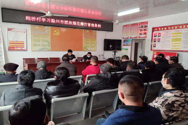 鮑橋村組織村民學習《滁州市燃放煙花爆竹管理條例》,號召廣大村民自覺遵守禁、限放規定,積極舉報違法違規銷售、燃放煙花爆竹行為,對查證屬實的,在為舉報人保密的同時給予物質獎勵。