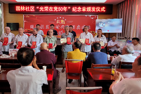2021年 6月28日,千秋街道園林社區在社區會議室舉行莊重簡樸的儀式,向15名老黨員代表頒發“光榮在黨50年”紀念章。