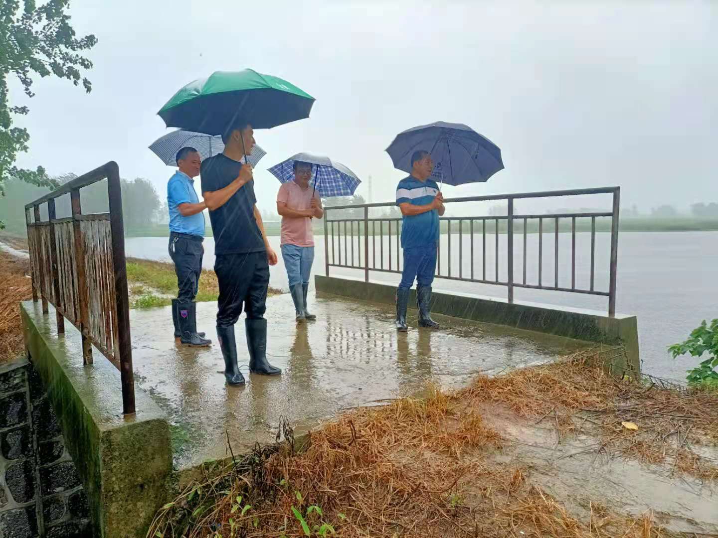2021年7月27日,鎮黨委委員統戰部長朱正峰、團結村負責人楊開福及兩委班子成員頂風冒雨落實防汛工作部署。重點查看轄區內東風水庫、沈家壩水庫水位情況,檢查壩堤是否存在安全隱患,排水渠道有無物體遮擋、是否通暢,時刻防范降水量大引發安全事故,切實保障群眾生命和財產安全。
