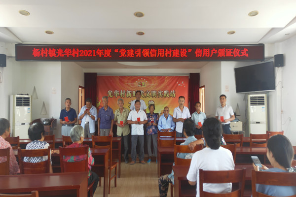 2021年9月18日,為縱深推進黨建引領信用村建設,推進信用結果轉化和運用。楊村鎮光華村舉行2021年度“黨建引領信用村建設”信用戶頒證儀式。光華村任保貴同志在會上匯報了黨建引領信用村的前期工作開展情況并對下一步工作進行了安排部署。特別強調,我們要以金融為支撐,積極運用黨建引領信用村建設成果,支持金融機構精準對接經營主體需求,促進光華村產業振興、鄉村振興。