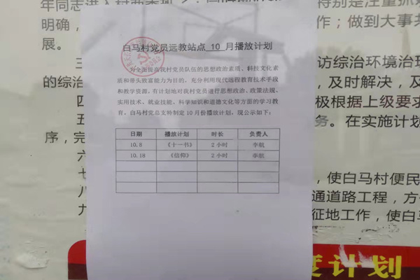 為全面提高白馬村黨員隊伍的思想政治素質、科技文化素質和帶頭致富能力,充分利用現代遠程教育技術手段和教學資源,有計劃地對我村黨員進行思想政治、政策法規、實用技術、就業技能、科學知識和道德文化等方面的學習教育。白馬村黨總支特制定10月份播放計劃: