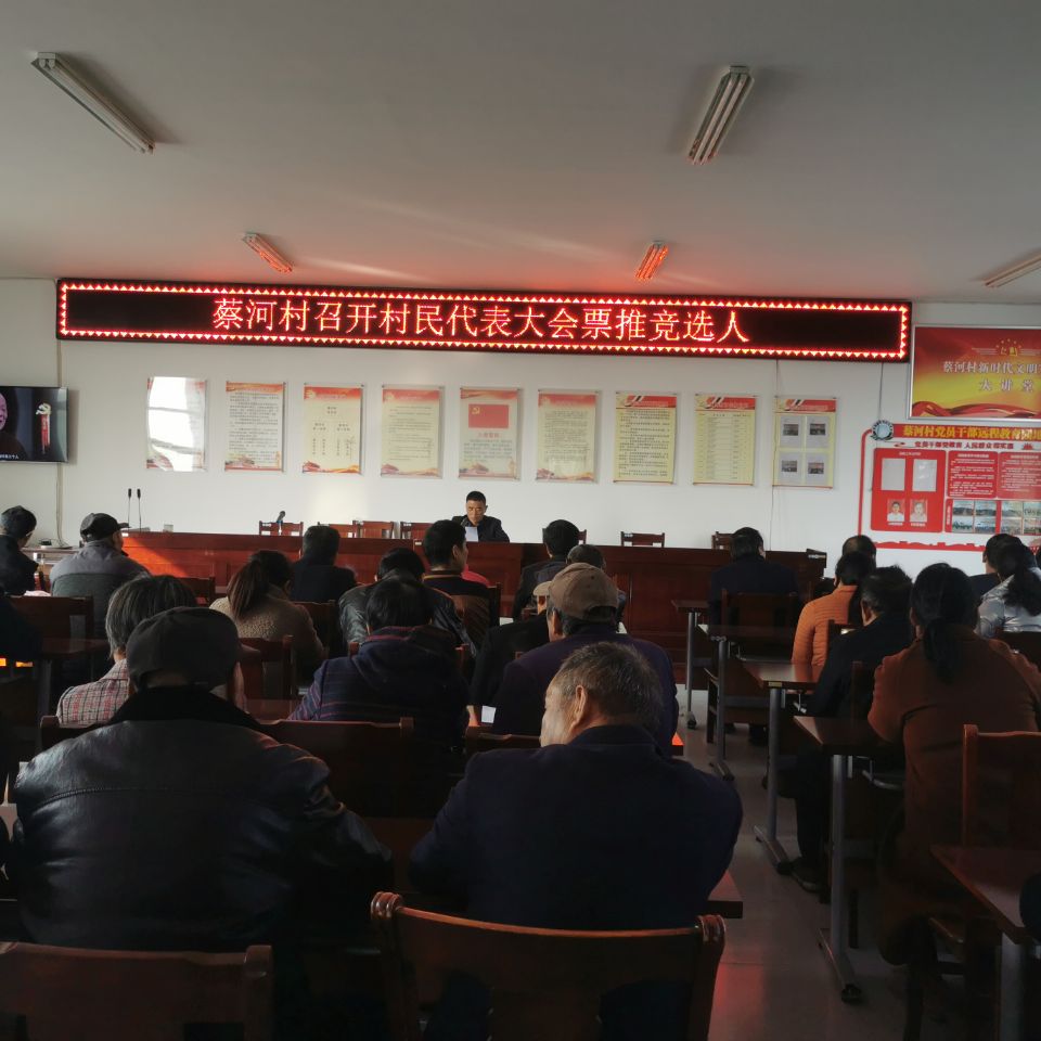 2021年11月18日,蔡河村在黨員活動室組織召開第十一屆村民代表大會,參加的會議有各組村民代表、選舉委員會成員、黨員共計48名。本村第十一屆村民委員會初步競選人通過黨組織提名、自薦、群眾推薦等方式。最終通過村民代表票推的方式產生,此次村民代表大會產生8名競選人。