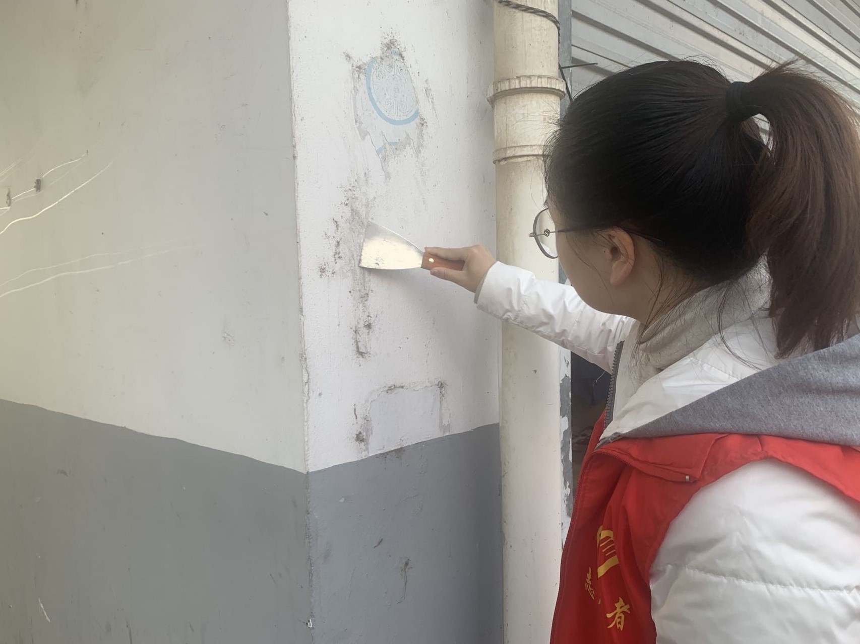 活動開始首先向志愿者們介紹了萬壽社區(qū)當前的情況,號召廣大青年志愿者積極參與。接著,志愿者們分成兩組,身著統(tǒng)一的志愿者服裝,拿著小板刷、清潔球、水桶等工具,沿著萬壽大道、天萬路兩條主干線清除“牛皮癬”。面對張貼在集貿市場外墻、電線桿上形形色色的小廣告、小橫幅,志愿者們互相合作,齊心協(xié)力與“牛皮癬”作斗爭。
