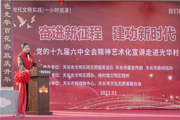 2022年1月30日,在楊村鎮(zhèn)光華村廣大人民群眾的熱切期待下,一小時巡演活動如期舉行。此次活動由天長市文明實(shí)踐志愿服務(wù)總隊(duì)、天長市委宣傳部、天長市委網(wǎng)信辦主辦,天長市文明實(shí)踐辦、楊村鎮(zhèn)文明實(shí)踐所承辦,天長市融媒體中心、天長市文化志愿者聯(lián)合會協(xié)辦,市政府相關(guān)部門領(lǐng)導(dǎo)蒞臨觀看演出。巡演節(jié)目包括舞蹈《吉祥中國年》、琴書表演《六中全會放光芒》、歌曲《我愛你中國》、快板《全會精神進(jìn)農(nóng)家》、揚(yáng)劇情景劇《百年奮斗鑄輝煌》、薩克斯表演《走進(jìn)新時代》、單口相聲《海大話》、琴書說唱《鄉(xiāng)村振興幸福年》、花船調(diào)《小小花船蕩起來》。活動中,我們還請來了特別嘉賓——中國好人黃宗玉,進(jìn)行一刻鐘的宣講《共同富裕在路上 幸福光華有韻味》,呼吁光華村人民為建設(shè)幸福光華,實(shí)現(xiàn)共同富裕奉獻(xiàn)自己的力量。