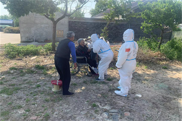 在沂湖村工作人員和醫務人員相互配合下,對行動不便的老人進行上門核酸采樣。