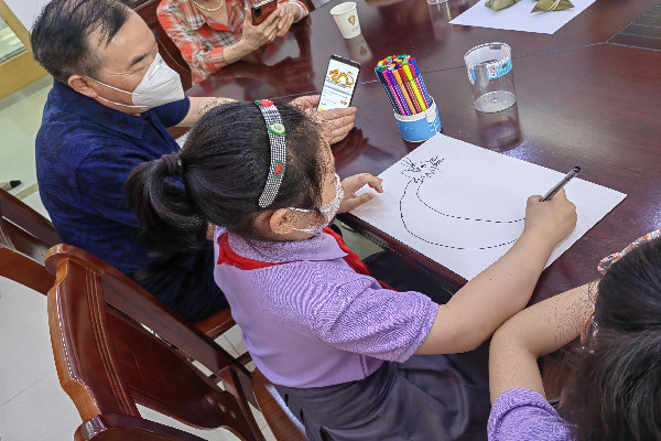 活動現場僑胞、僑眷們歡聚一堂,邊交流溝通邊與城南小學的孩子們一起畫粽子、畫龍舟。“粽子四個小角尖尖的、粽葉綠綠的……”僑胞、僑眷們和孩子邊說邊畫,你教我畫、你說我看,大家各自分工,社區活動室里洋溢著快樂端午的氛圍。