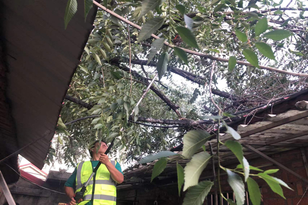 由于連日來的大風天氣,6月22日上午,位于廣陵街道潯河社區土產公司院內的一棵大樹發生倒塌,倒伏到一戶居民的房頂上,給過往車輛及行人帶來較大安全隱患。