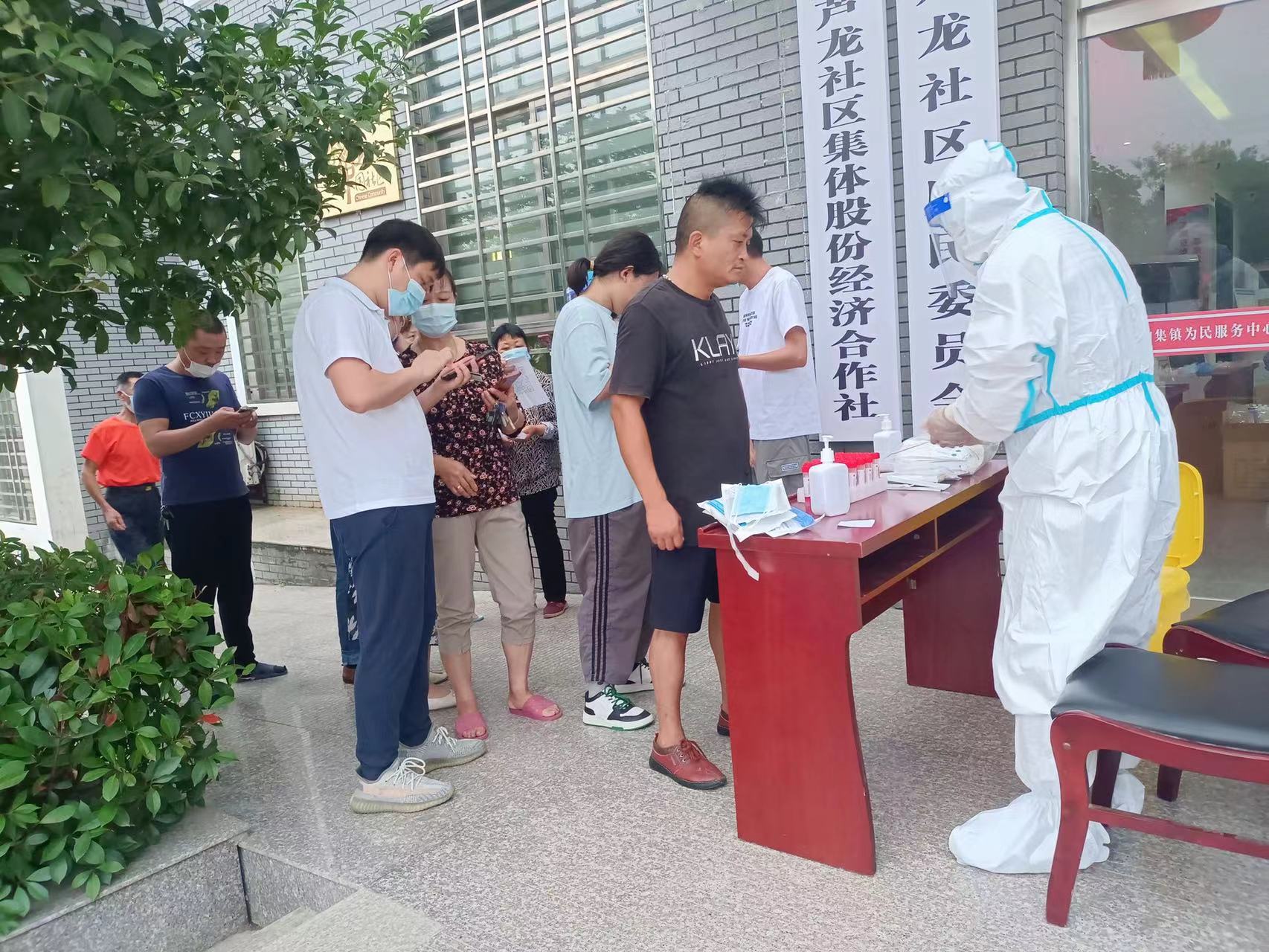 7月17日上午4點半,蘆龍社區工作人員和志愿者在社區廣場和徐莊居民組進行核酸采樣點布置準備工作,5點半醫護人員開始核酸采集工作。此次核酸檢測歷經4個小時,共采樣1800余人次。