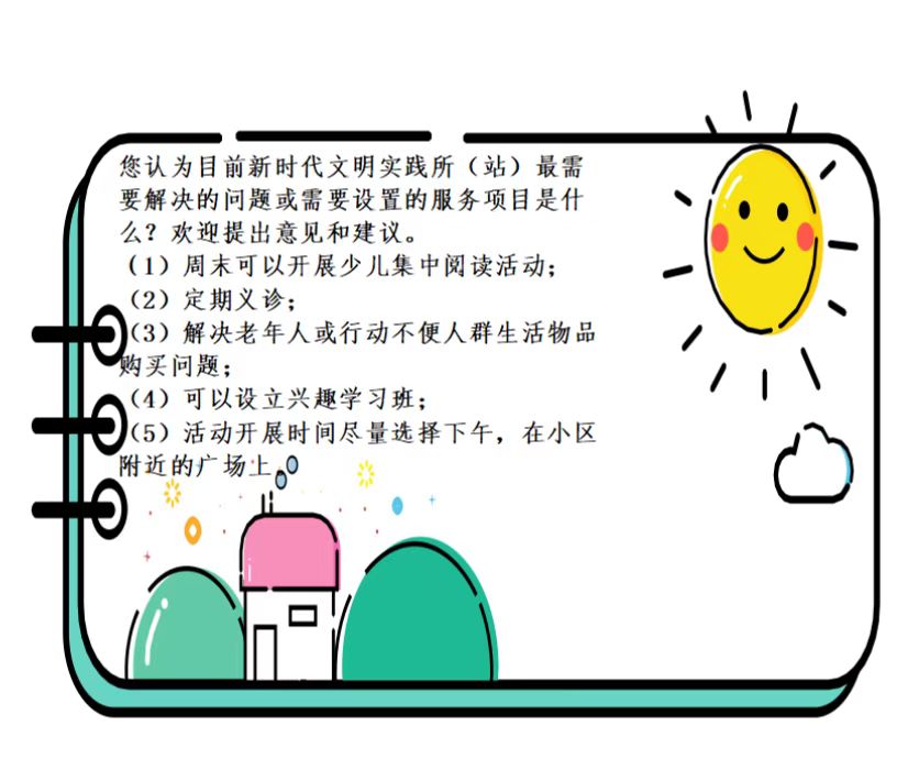 鎮(zhèn)域內(nèi)居民還對今后永豐鎮(zhèn)新時代文明實踐工作開展提出肯定和建議,主要涵蓋開展活動類型及內(nèi)容“活動開展頻率”“活動覆蓋人群”“舉辦活動時間和地點”等內(nèi)容。這些建議對完善永豐鎮(zhèn)今后的文明實踐工作有著重要的指導作用,永豐鎮(zhèn)將根據(jù)本次調(diào)研問卷進行調(diào)整優(yōu)化,著力把新時代文明實踐所(站)建設成為學習傳播科學理論的大眾平臺、加強基層思想政治工作的堅強陣地、培養(yǎng)時代新人和弘揚時代新風的精神家園,開展具有“田園永豐”特點志愿服務的廣闊舞臺。