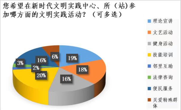 群眾是新時代文明實踐的參與者、受益者、傳播者。調(diào)查顯示,大多數(shù)居民對于理論宣講、文藝活動、健身活動、技能培訓、便民服務類活動的興趣較高。今年以來,我鎮(zhèn)在實踐所、各村(社區(qū)))實踐站、三元廣場、農(nóng)戶大院、村議事點等陣地開展學習講堂、政策宣講、志愿服務、文藝活動、積分評選等文明實踐活動,舉辦“學雷鋒”公益集市等活動近50場,開展宣傳教育活動468場,解決群眾“急難愁盼”問題215件。本次的問卷調(diào)查更是給我們?nèi)蘸蟮墓ぷ髦该髁朔较颍涸谙鄬ω毞Φ慕∩砘顒雍图寄芘嘤柣顒由舷鹿Ψ颉R皇峭诰蚪∩砣瞬牛闪?ldquo;菜單式”健身志愿服務伍,將科學健身與志愿服務相結合,開展科學健身指導志愿服務活動,著力構建更高水平的全民健身公共服務體系,為廣大群眾提供包括跆拳道、廣場舞、太極拳、競走、球類等10個項目的培訓指導服務。二是線上+線下方式調(diào)查收集居民朋友的技能需求,邀請相關專家定期進行技能授課和學習考察,切實提高群眾再就業(yè)的能力,豐富群眾的文化生活。我們將結合群眾的生產(chǎn)勞動、文化生活和實際需要,充分發(fā)揮好新時代文明實踐所(站)的陣地作用,用群眾聽得懂、喜歡看的形式開展文明實踐,增強工作的針對性、實效性和吸引力、感染力。