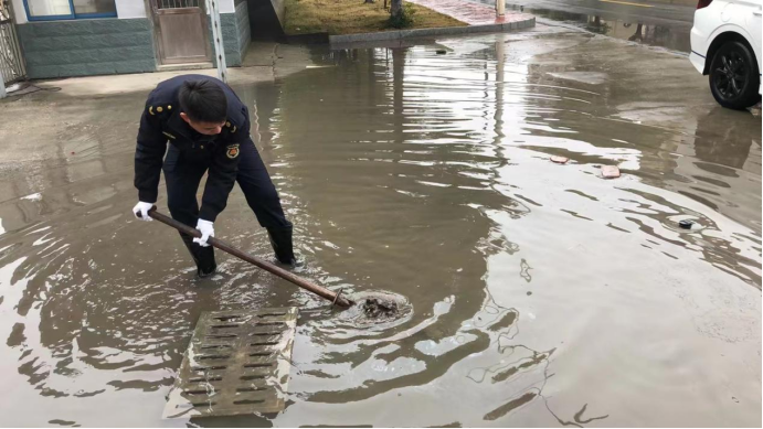 近日,永豐鎮執法中隊在日常道路巡查中發現創業路路面嚴重積水,經過對現場的勘驗,造成該處積水的原因是由于下水道堵塞不能順利排水,導致積水全部排到路面,嚴重影響了行人安全,存在較大道路安全隱患。執法人員立即向上級匯報了現場情況后,及時清理路面垃圾,同時設置了安全警示標志,疏通排水設施,確保排水通暢,盡量降低雨水造成路面積水帶來的不便,確保行人安全通行,保障道路通暢,經過一個多小時的積極奮戰,路面已經清理干凈,恢復暢通。