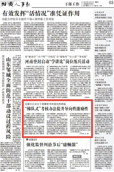 在梯隊劃分上,該市按照“基礎層、建設層、成果層”分成3大類9個模塊的考核梯隊,其中“基礎層”指組織委員參加會議、報送材料、基礎工作等情況;“建設層”指承擔調研評估、試點項目、典型創新等情況“;成果層”指處理群眾信訪、組織宣傳、其他履職成果情況等。實施“實績月報+季度通報+半年督查+年度考核”指標量化考核模式,確保組工干部平時表現實時可控、隨時可查。