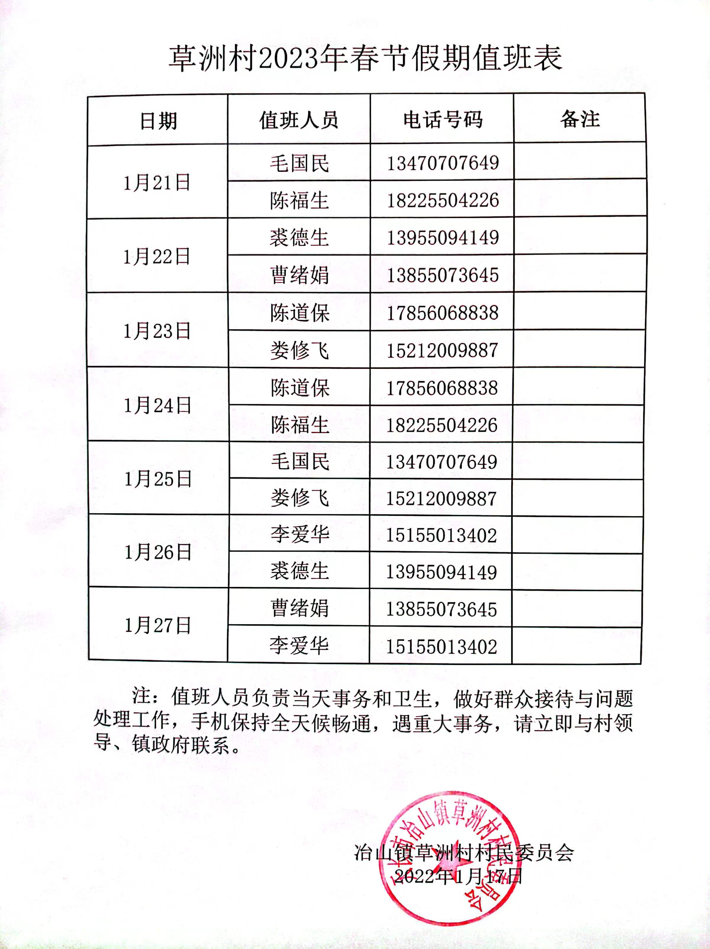 根據國務院2023年節假日的安排,春節假期從1月21日至1月27日,1月28日、29日正常上班,假期期間草洲村值班工作安排如下,村民有事可以聯系值班人員。祝全體村民2023年新年快樂!