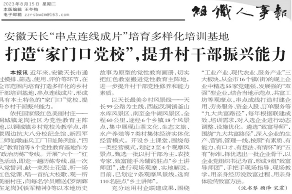 近年來,安徽天長市通過摸排、篩選、使用、評價等環節,在全市范圍內培育打造多樣化的鄉村干部培訓基地,串點連線成片,形成具有本土特色的“家門口”式黨校,提升鄉村干部振興能力。