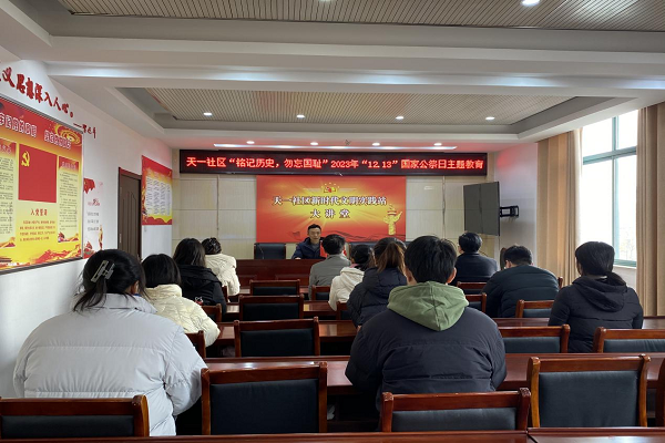 在主題教育會上,全體參會人員向在南京大屠殺中遇難的30萬同胞和為祖國犧牲的革命英烈默哀致敬,以示銘記與慰藉。社區黨總支書記唐來平以《銘記歷史,勿忘國恥》為主題,講述了南京大屠殺的屈辱歷史,激勵全體工作人員、轄區黨員和居民群眾要牢記歷史,勿忘國恥,自強不息,用自己的行動為實現中華民族的偉大復興而不懈努力。隨后,哀樂奏響,全體人員肅立,默哀。參與主題教育的居民小陸說道:“通過主題教育活動,我再一次意識到今天的幸福生活有多么來之不易,作為一個中國人,我將銘記這段悲痛的歷史,自強不息努力奮斗。”會議尾聲,黨員代表盛菲帶領大家一起宣讀了《和平宣言》,“讓戰爭遠離人類,讓和平灑滿人間……”。