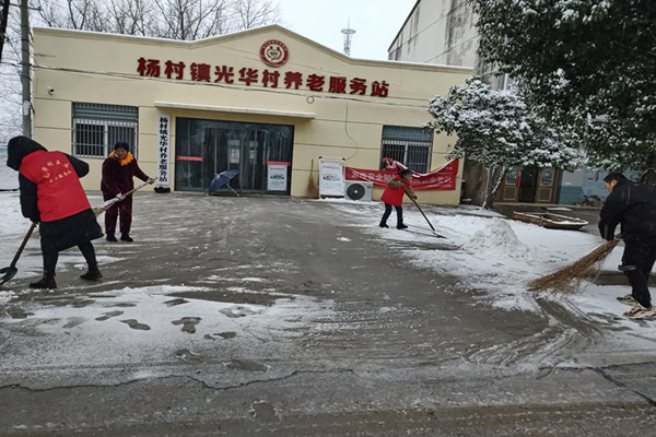 在兩位同志的帶領下,光華村村干部穿上志愿服,拿上工具,認真清掃老年服務中心門口的積雪。還安排人將小區主要道路清掃干凈,確保群眾的出行安全。身為黨員干部,時刻把群眾記在心里,更把需要關懷的老年人放在心上。